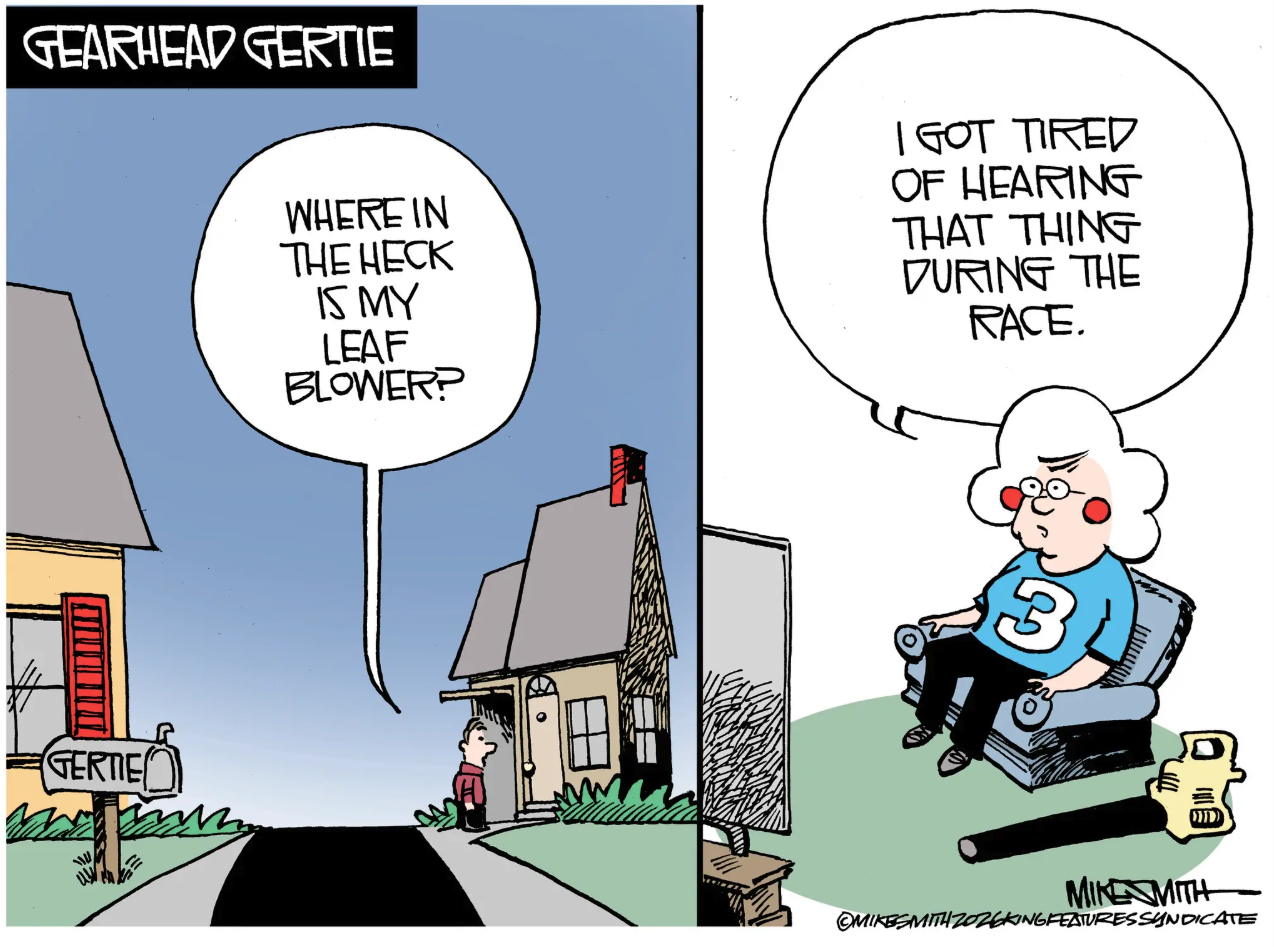 Look, I don’t want to say that there’s only so many jokes you can make in a recurring comic panel that is committed to only doing jokes about NASCAR. I’m just saying that today we got to “You know what can interfere with your enjoyment of NASCAR? Your neighbor’s leaf blower. What if there was someone who loved NASCAR so much … that she did something about it,” which, honestly, having typed that out, I actually think is pretty good. I hope we go further down this road. Gertie will stop at nothing to remove all distractions from her monomania! She will leave a trail of dead behind her, you must remain silent at all times