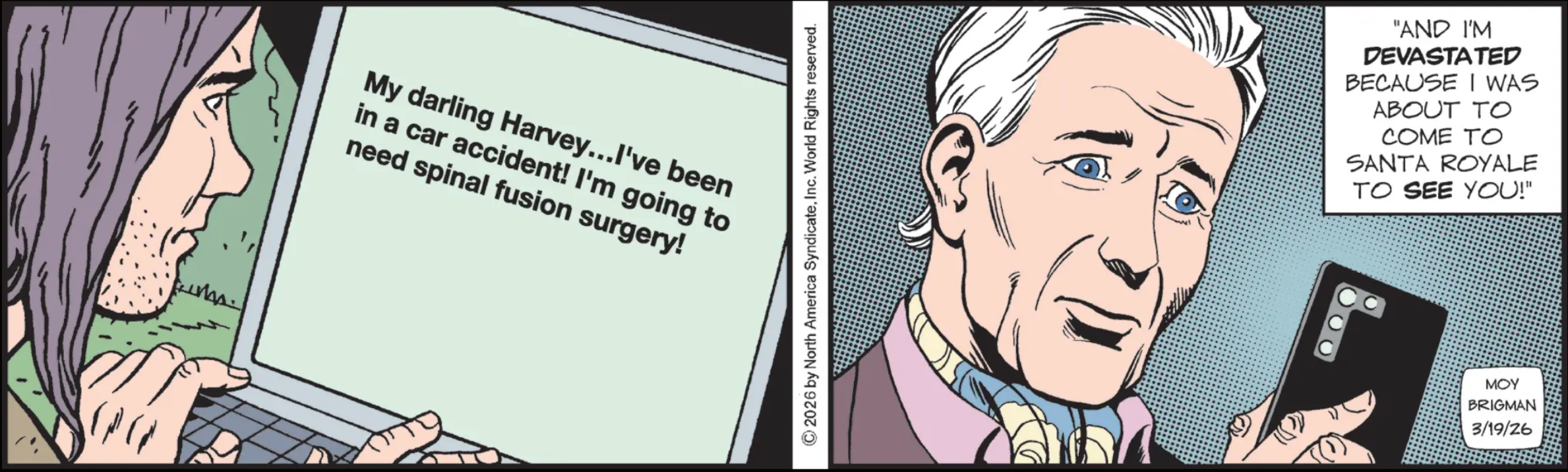 Mary Worth : H@rv’s reaction isn’t one of sympathy and of having been suckered into sending money to his online girlfriend, it’s one of “Good Heavens!? Paralysed from the waist down!? …That complicates things, I don’t know if I can be attracted to an INVALID…”