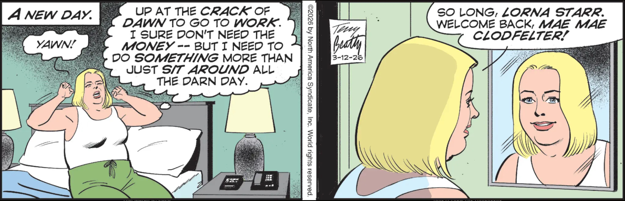 Oh, I didn’t mention that the Hollywood starlet turned recluse turned runaway in the current Rex Morgan, M.D., storyline was named “Lorna Starr” — because she used to be a star, GET IT???? — but now, in order to go incognito in her new, roots-country-forward community, she’s going by “Mae Mae Clodfelter.” I guess this is supposed to be her actual name, or maybe she’s just decided to go by the most country name she can think of? Either way, I think even in a town where guys named “Buck” and “Truck” and “Mud Mountain Murphy” walk the streets, people are going to think that’s a bit much.