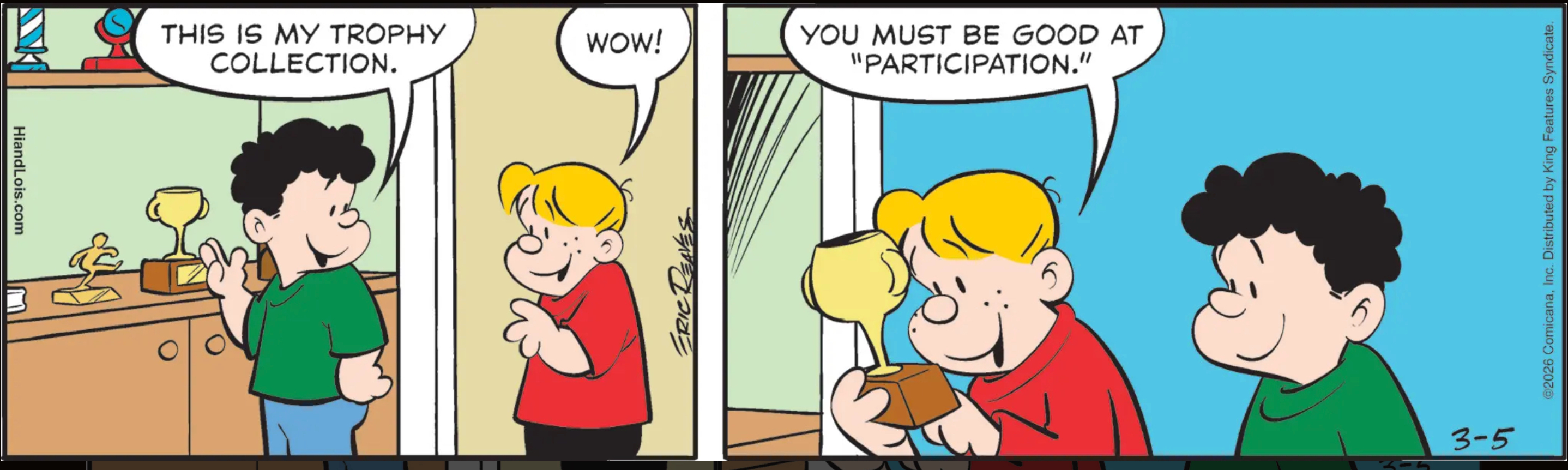 Hi and Lois: Sure, the biggest trophy that kid has is for participation, but he’s also got one for…kicking? And what looks like a tiny barber’s pole, so his coiffure is probably his own, and one that’s so abstract it could be for anything but it’s still an award. Good job, kid, your trophy for participation is well earned!
