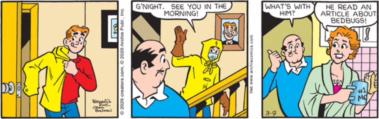 Archie: It’s a good thing that framed portrait of Archie is in the second panel so that no one has to go back and reread the first panel to remember what he looks like without the raincoat and mask.