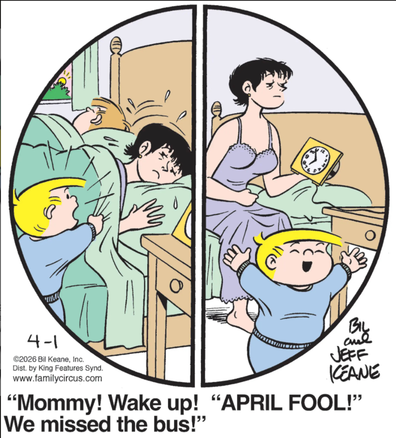 Because of Family Circus‘s split-screen layout-and-captions combo, I read today’s strip as “Mommy, wake up! April Fool’s!” followed by an offhand “We missed the bus,” probably from Billy but maybe from Thel?