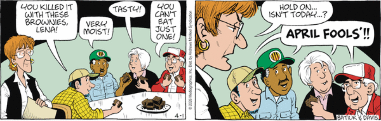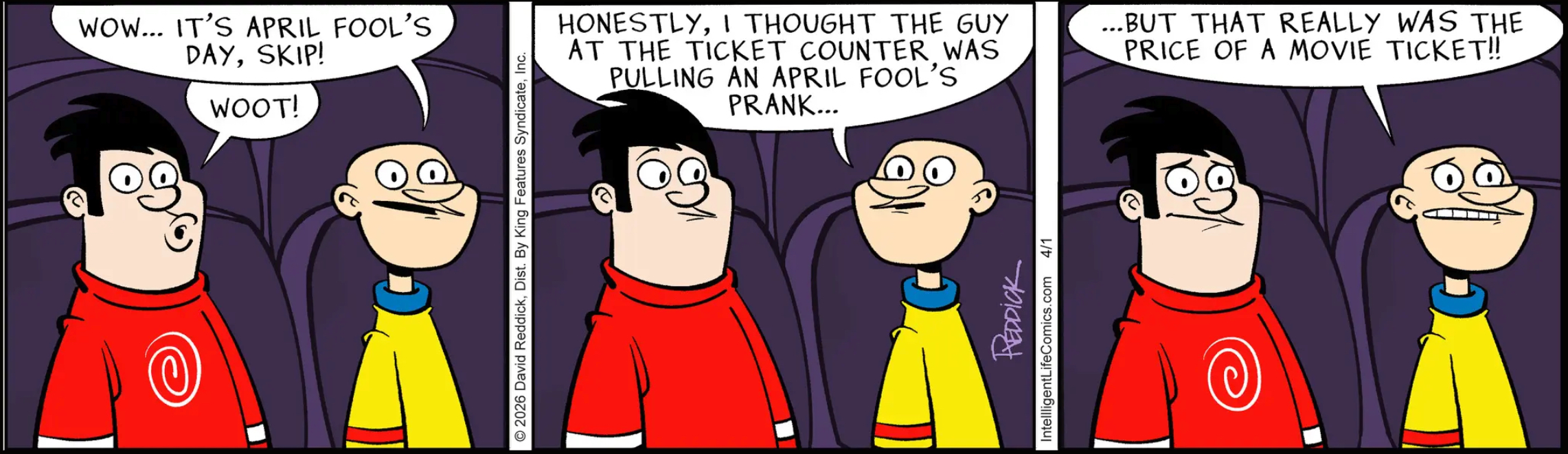 Not even going to engage with the prank content on this one. These guys know what movie tickets cost! They see movies in the theater all the time, and talk about box office numbers while they’re there! Instead, I just want to point out that in panel one Skip has responded to “Wow … it’s April Fool’s Day,” with “Woot!”, which is absurd. Nobody’s excited about April Fool’s Day. This is just another example of these losers responding to any cultural reference they recognize with a sort of Pavlovian noise of general approval. It says a lot about society, and it sickens me.