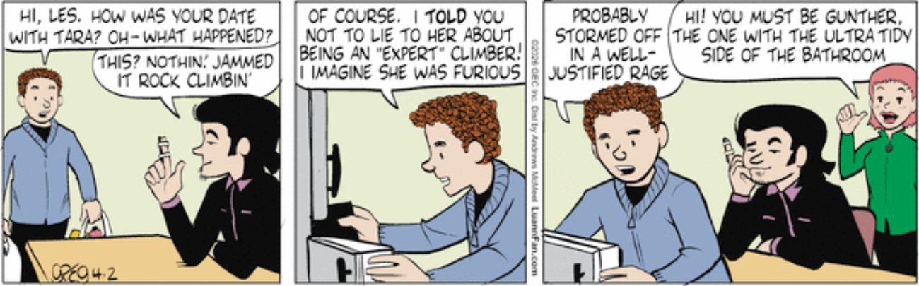 Luann: Disappointing failure to build on the rock climbing set-up. I really thought Les would say he broke that finger while working it into a slippery crevasse – or given Luann‘s usual celibacy, just trying an overambitious free solo.