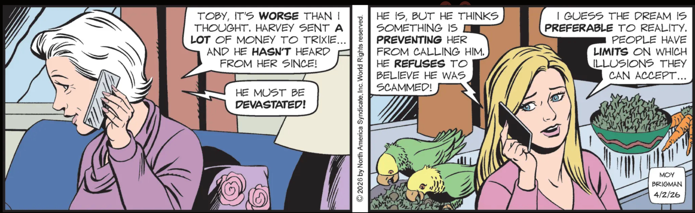 Mary Worth: Truly enjoying how Mary is holding her phone gingerly, with the tips of her fingers, and upside-down. She doesn’t need this conversation! She’s never needed it! Meddling is strictly a one-way street, how’s that for a reality sandwich, Toby?