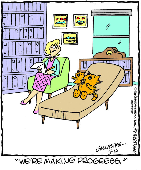 “Heathcliff sees a therapist” is an occasional bit in this strip, and I don’t care for it because I really don’t think it’s a match for his character. Heathcliff may have any number of real psychological issues, but I think he’s pretty happy with himself and lacks the desire to change that usually drives people to therapy. Anyway, despite what the therapist says, I appreciate the fact that today makes it clear he doesn’t take the process very seriously.