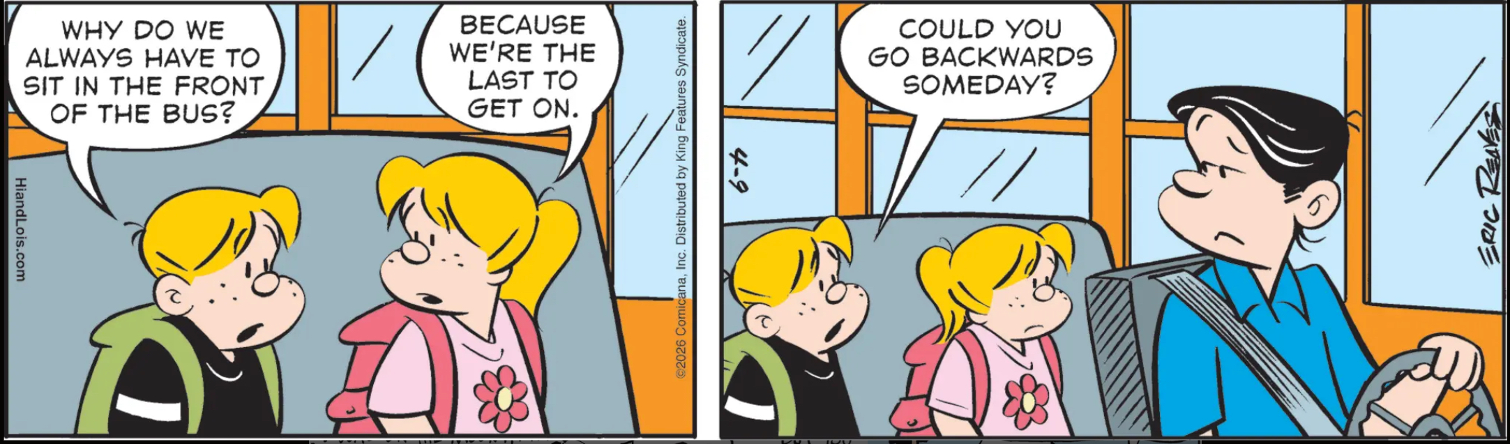 Hi & Lois : that guy is going to go backwards next time… after driving right past Dot & Ditto without picking them up, so he can back up over them, and squish them. Then he’ll be just like his hero, Ed Crankshaft!