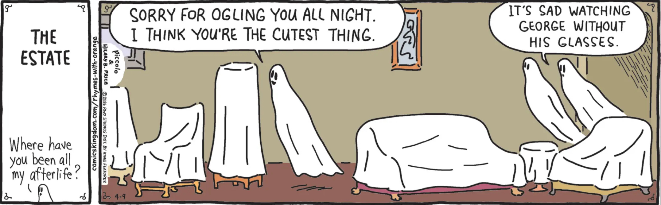 I assume the intended joke here is that George forgot his glasses somewhere else — at his home, maybe, or maybe just in the other room — but I can’t stop imagining a truly nightmarish scenario where when you die you become a spirit cursed to haunt the world of the living but not be perceived by them, and if you had bad vision when you were alive you still do, but you can’t wear glasses because you’re a spectre without physical form and/or you don’t have a nose. Anyway, that ghost is gonna fuck that cabinet, right? That’s definitely what’s on the menu here?