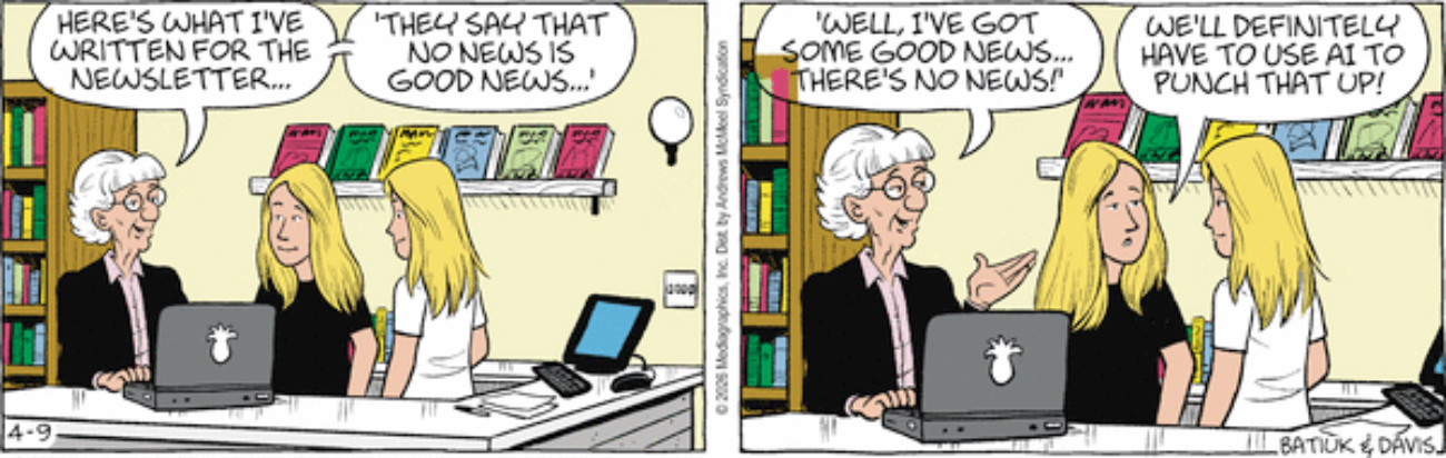 Hey, uh. Um. How to put this delicately. I think if you’re involved in the process of churning out a legacy comic strip, maybe you … shouldn’t … do jokes that are like, “You know what’s better than hack writer? AI! Ha ha!” Just, like … don’t give people ideas, you know? About your job?