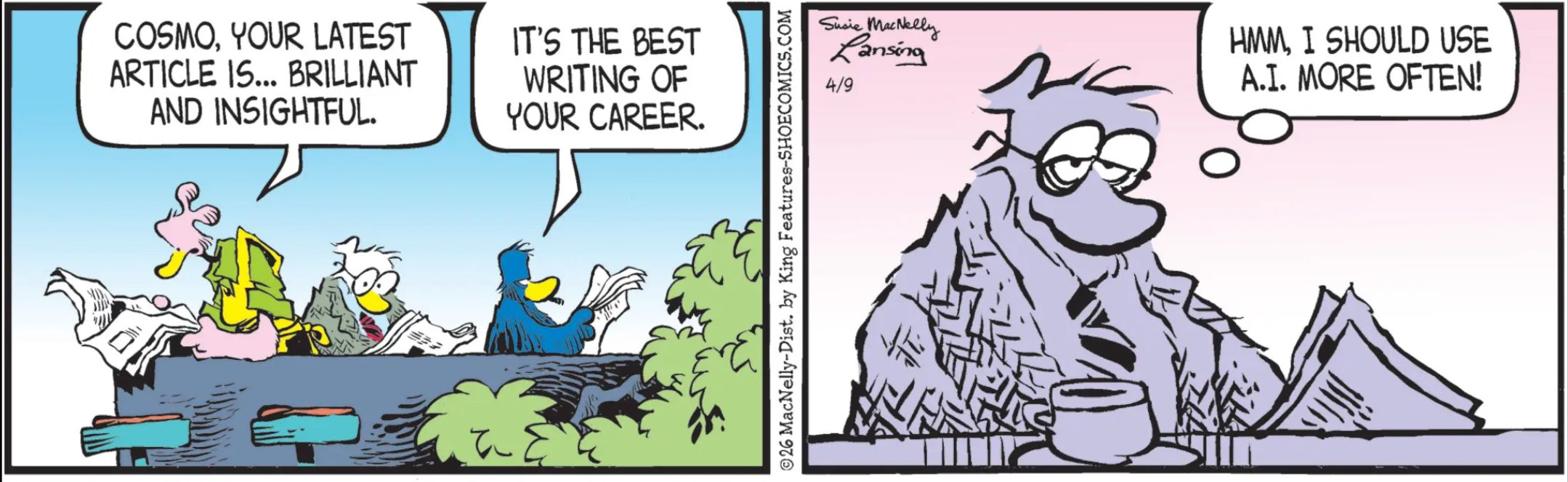 Shoe: Why does Cosmo look so smug in the final panel? I work in AI. If someone told me my AI-generated op-ed was the “best writing of my life,” I’d either want to destroy myself or the universe, whichever one was easier.