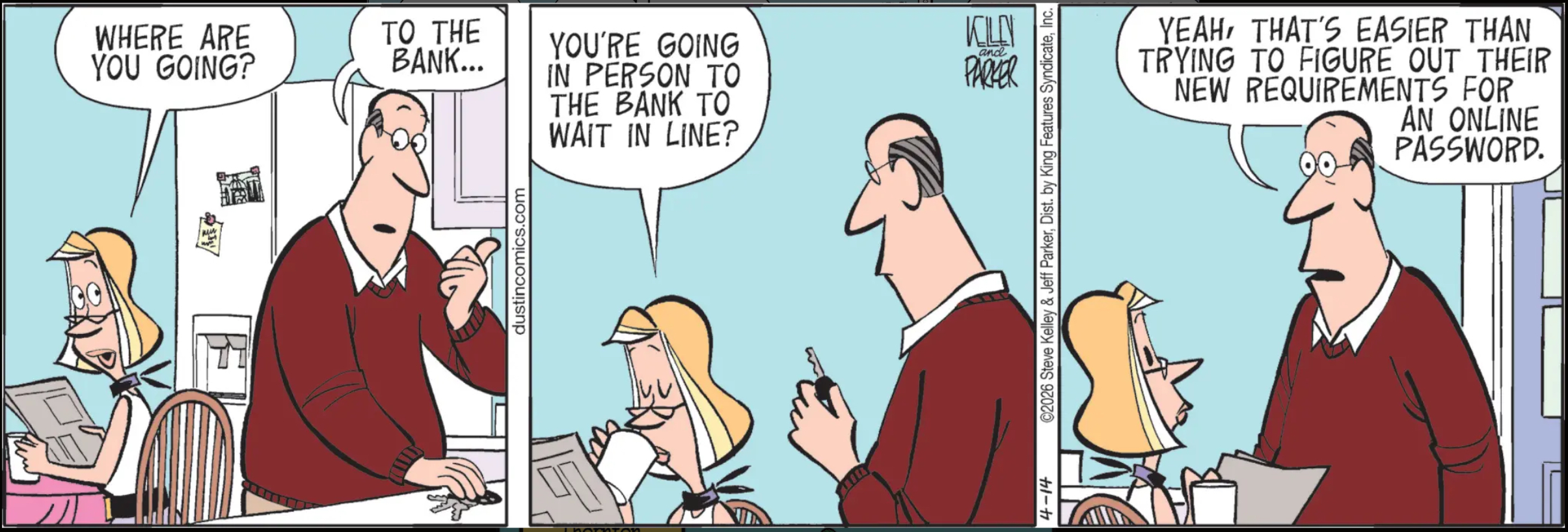 Dustin: “You’re going in person to the bank to wait in line??!!” “Well, yeah — it’s not like I could get cash dollars to make it rain at the strip club from their website! (Oh, also, passwords are hard.)”