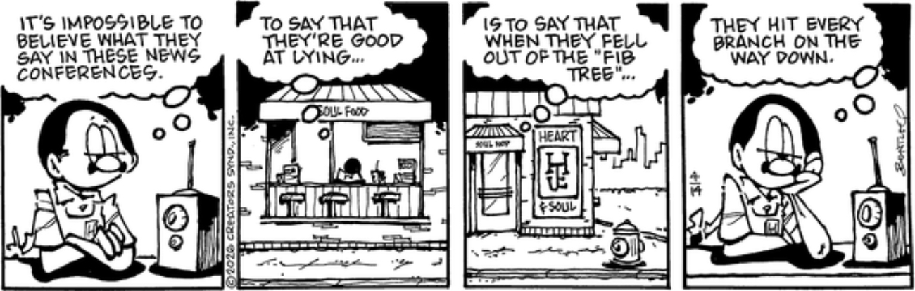I’ve heard the expression “Fell out of the [X] tree and hit every branch on the way down” applied on a wide variety of colorful topics, so when Herb puts quotes around “fib tree” it tells me he’s not merely constructing an elaborate metaphor to say the thing he’s saying, but the whole bit about lying politicians is just a setup for a pun about fig trees. Boy I wish I had a worldwide audience for thinking bad puns at myself without provocation. I’ve got a great one on “non sequitur” I’ve had locked and loaded for years with no opening to use it.