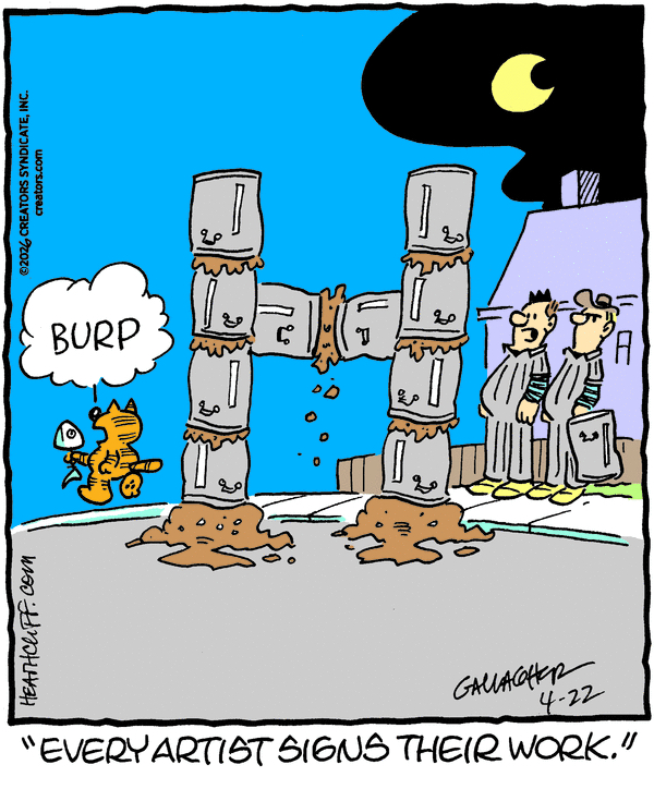 One thing I love about newspaper comic strips is that they’re full of visual signifiers that are multiple generations out of date at this point but just kind of stick around out of inertia, which would confuse any young people reading them if young people still read the comics. Until the medium is truly dead, everyone will have bone-in hams in their refrigerators and everyone will simply dump their garbage into a metal can, without even putting it in a plastic bag first, until it merges together in a grotesque brown slurry. Did you know that garbage slurry is viscous enough to serve as a powerful adhesive? Heathcliff does, and he’s made it his artistic medium.