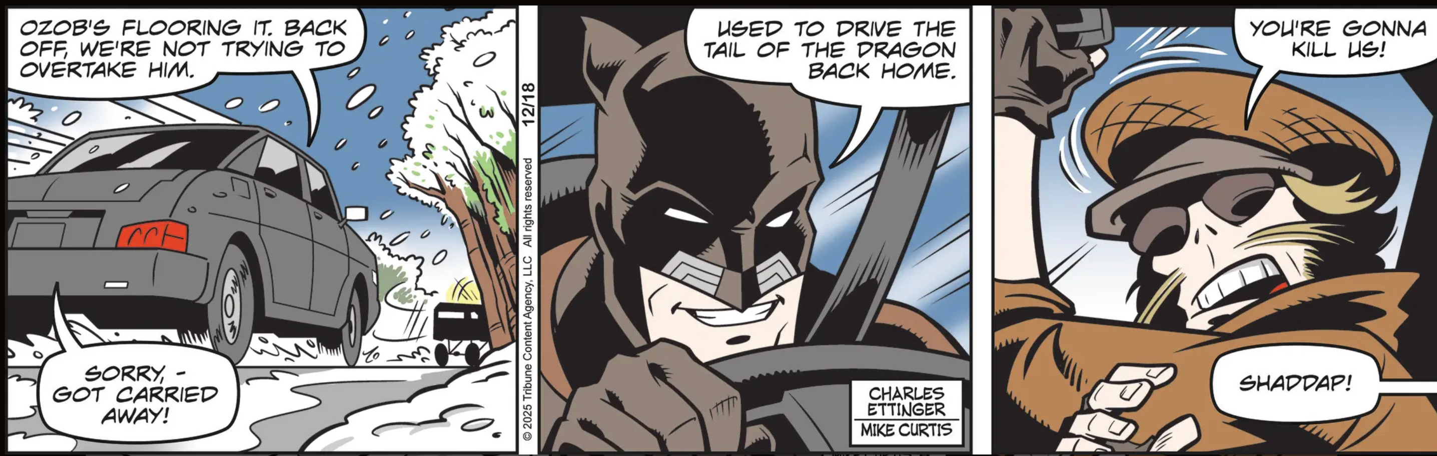 There was a certain amount of chatter in the comments on the day of Ghost Cat’s big reveal, with some people claiming that cat-themed superheroes are not what you’d call traditionally “masculine.” But the Ghost Cat is trying to disabuse everyone of those notions in the course of this car chase: grinning maniacally as his fellow lawman begs him to slow down, muttering something inscrutable about “driv[ing] the tail of the dragon,” that sort of thing. Very butch.