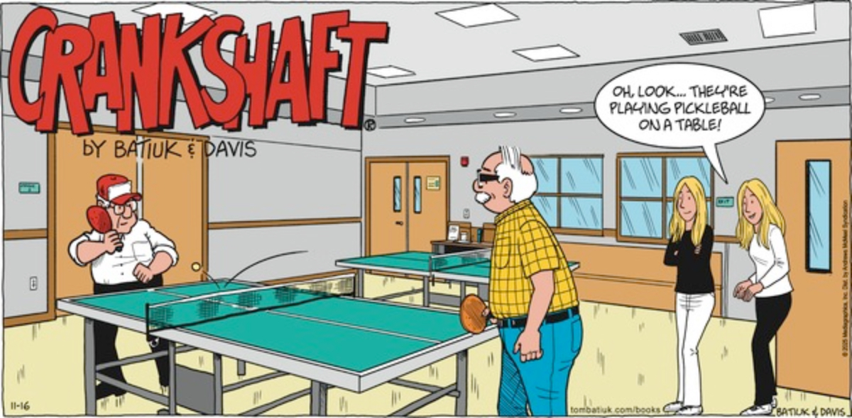 Look, not to get close to finding Crankshaft relatable or anything, but a thing about getting older is that you’ll think “C’mon, this aspect of culture is relatively recent,” and then you look it up and it’s actually like 10 or 15 years old, and there are plenty of people who are full-on adults now who would never remember a time it didn’t exist. Anyway, I was about to go on a quest to figure out when the whole pickleball craze took off, got as far as some suggestions that the game (which has been around since the ’60s, and was invented by the last Republican to serve as Lieutenant Governor of Washington) became popular as an outdoor activity during the COVID-19 lockdowns, then looked dug into my archives discovered that these teen twins were tweens or maybe even younger in a 2021 strip and decided, you know what? I’m gonna let this one go. I’ll allow it. Ha ha, to a young person, ping pong would seem like a pickleball variant, wouldn’t it?