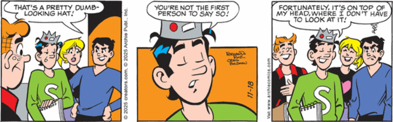 Sure, yes, Jughead’s hat is dumb-looking, or at least extremely out of date, but here’s the thing, Reggie: he’s been wearing it, depending on how you think of the chronology, either since 1941 or the whole time you’ve been in high school together. Everyone has already arrived at an opinion about it, and probably has pretty much stopped thinking about it, years ago! What made you think this would be a successfully sick burn that would raise your clout amongst your peers?