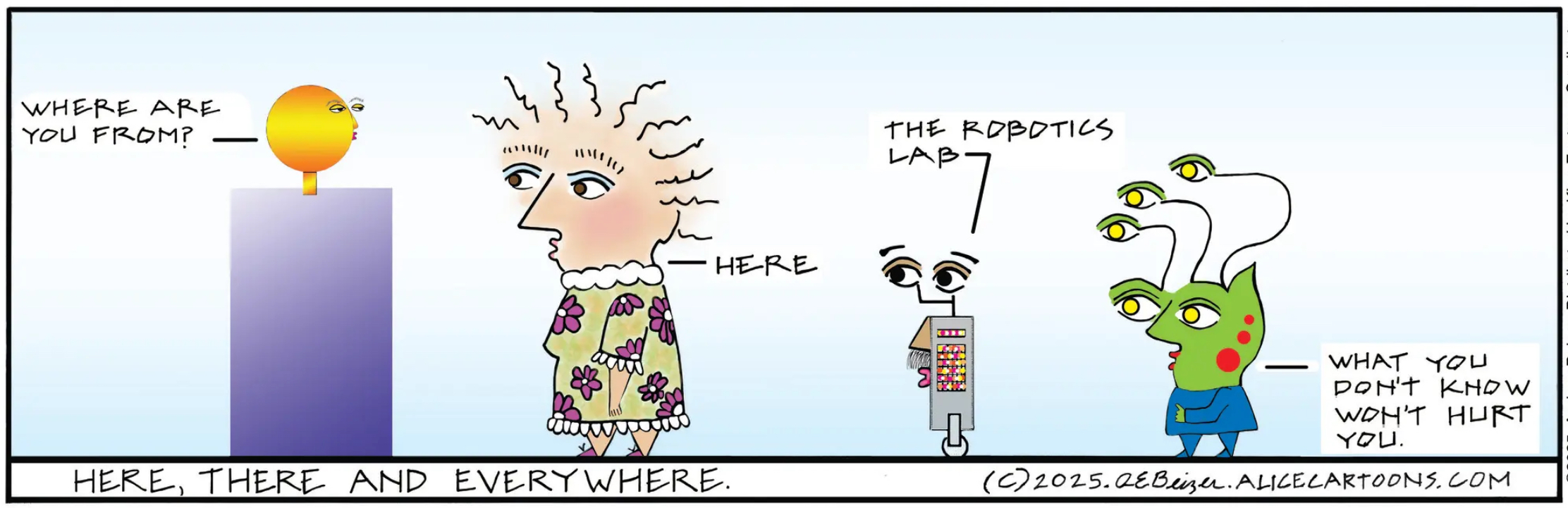 We all know of course about the various beloved characters in Alice, the normal comic strip we all read every day and fully understand: Alice, Alice’s friend, Alice’s boyfriend, Alice’s niece, and the late Kurt Vonnegut, who is both Alice’s doctor and her vet. Today’s strip features a couple of our more outlandish favorites, Alice’s robot antagonist and the space alien who’s in love with her, but also … someone new! A glowing orb of some sort who judges the living and the dead, or maybe just asks you where you’re from. Frankly there’s getting to be more of these guys than I would ideally like to keep track of! Yet I persist, for my faithful blog readers, for whom I read Alice and other comics so they don’t have to.