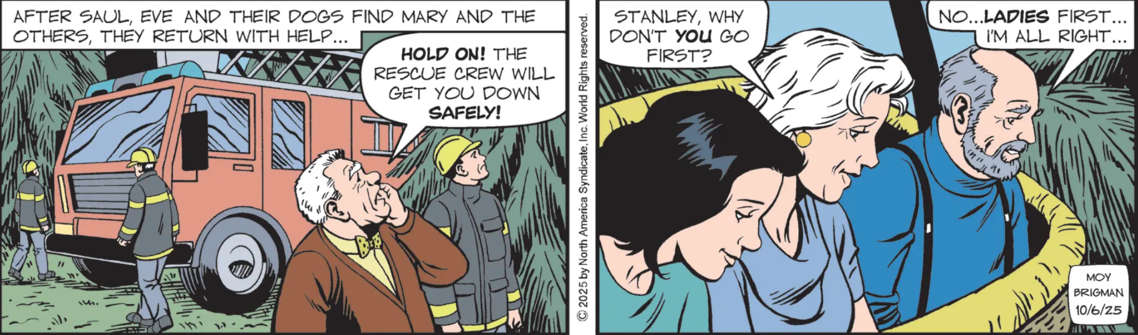 I’m honestly not comfortable with how pleased Stanley looks in panel two here. Sure, this could’ve ended in total disaster, but look at all these people who are now paying attention to Stanley, and concerned about his well being! Ha ha, Mary, ladies first, Stanley’s all right! Stanley’s as right as rain! There’s no such thing as a bad way to get attention, is what Stanley’s learning!