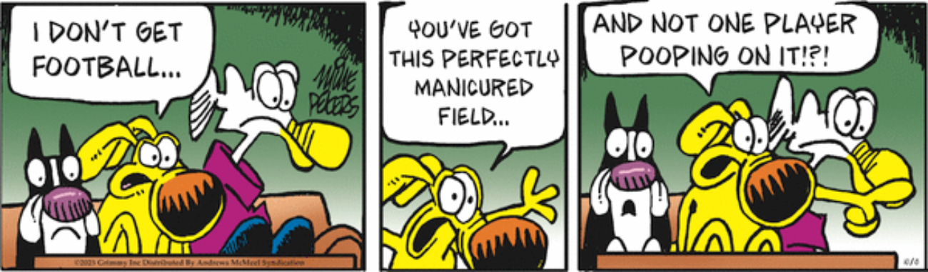 I can’t believe I’m saying this, but I’m now nostalgic for the time when syndicated newspaper comics scat content was confined to Marvin, where you could at least argue that he was a baby and so it was normal for him to poop into his diaper. I get that Grimm is a talking dog, but I still think it crosses some kind of line to have a newspaper comics strip character yelling “I don’t get it, why don’t these big, manly football players start shitting in the middle of the field on live TV so we can all watch it the way I know we all want to????”