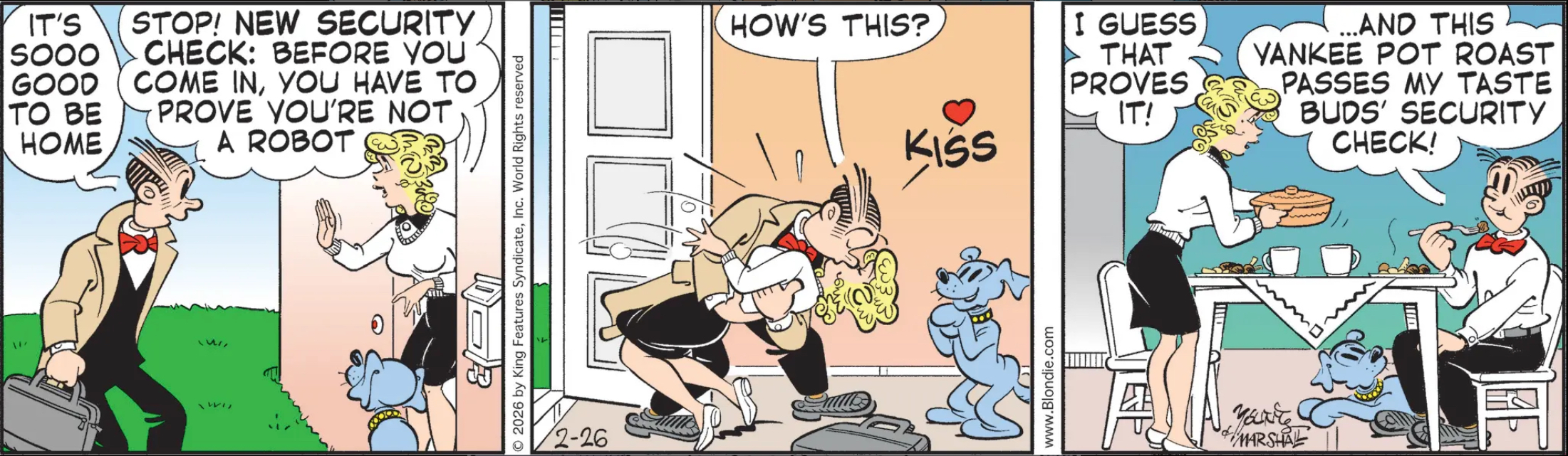 “Blondie wants Dagwood to prove his humanity by displaying sexual interest in her, and Dagwood doesn’t care if Blondie is a robot or not so long as his dinner is made of real meat” is, uh. It’s a little on the nose, I think.