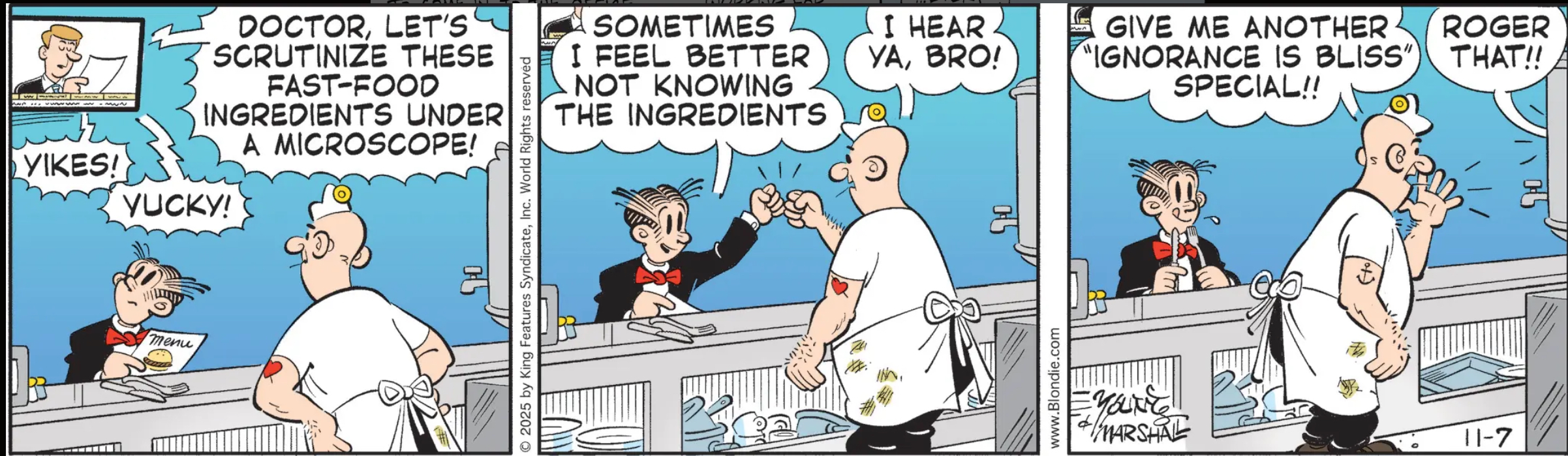 Kudos to the local news for not actually showing the grotesque imagery of magnified fast food and instead merely playing audio of the scientists’ horrified reaction. With Dagwood in town, they clearly know that they need to tread carefully when it comes to food-related news. On the other hand, the news team apparently lacks advanced studio equipment like “teleprompters,” forcing their anchors to simply read the news off a visible piece of paper, so it may be that they simply did not have the capacity to transmit other video content to their viewers.