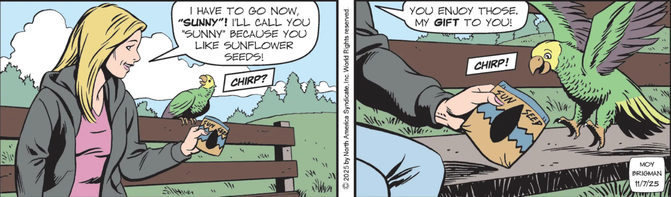 Sorry I haven’t been keeping you up to date on what’s been happening in Mary Worth, so I’ll recap: Toby met a parrot and then spent 72 hours trying to think of a name for it. This is the best she could come up with.