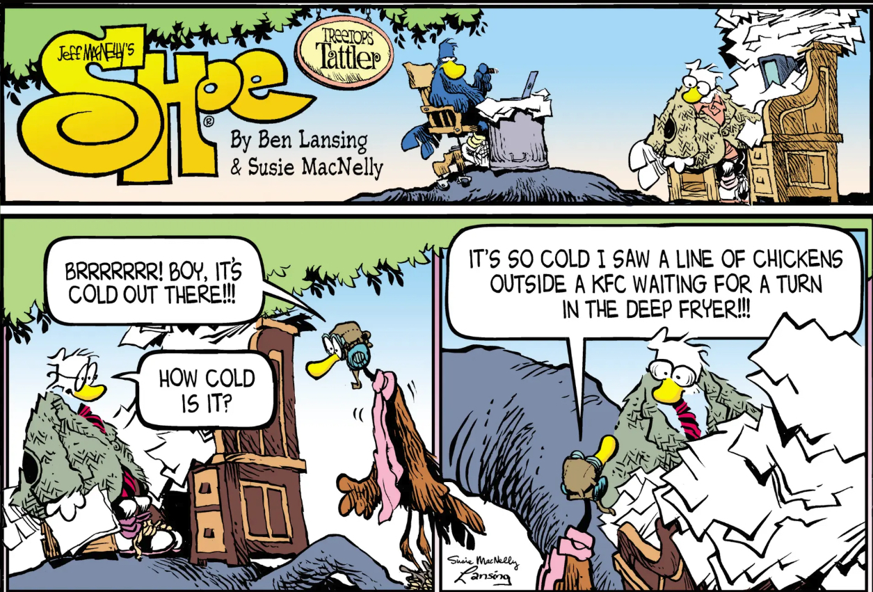 I know, I know this is a perennial gripe of mine, but: You absolutely cannot do whimsical jokes about birds in a comic strip where everyone is a bird. This is a joke about a number of these characters’ peers committing violent, awful suicide! It’s pretty believable that they’d do it, since all the bird-people in this strip are very depressed, and with good reason, since they live in a world dominated by sapient birds where nevertheless KFC is a viable business.