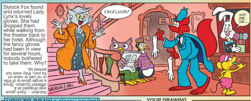 Now, this strip? Where Slylock Fox, a sapient animal cop in a world dominated by sapient animals, is providing enhanced security to a wealthy and influential sapient animal who is fairly obviously wearing a fur coat? That doesn’t make me mad at all. That’s just how the world works. That’s a mystery that kids need to learn how to solve a lot more than anything about gloves and how people won’t pick up just one lying there by itself no matter how lovely it is.