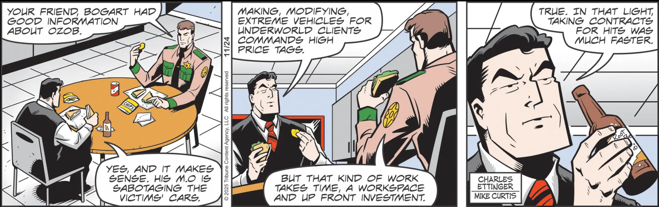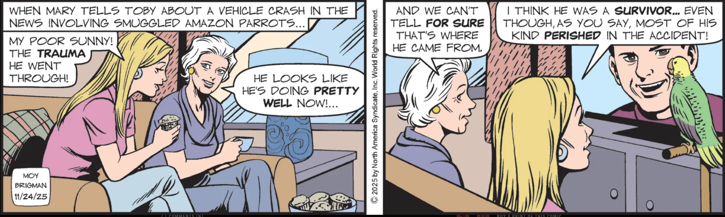 Uh, excuse me, Narration Box, that’s not just “the veterinarian,” that’s beloved Mary Worth tertiary character/Wilbur’s ex’s new husband, Dr. Ed! And boy, he looks happy, doesn’t he? Maybe it’s because he’s settling into the joy of married life now that the emotionally grueling wedding planning process is over, or maybe it’s just that today for once he gets to offer simple, helpful advice like “add good quality pellets to the food you give him” instead of euthanizing a bunch of dogs. And if his animal hospital is the only local vendor of the parrot pellet brand he recommends, well, that’s just an added bonus.